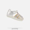dziewczęce, sportowe, wodoodporne sandały o swobodnym wyglądzie, z praktycznym, regulowanym zapięciem na rzep. wykonane z perłowego materiału imitującego skórę i błyszczącej siateczki w srebrnym odcieniu, flaffee mają półzamkniętą cholewkę ozdobioną letnimi nadrukami i detalami inspirowanymi outdoorem. to elastyczne, oddychające obuwie ma osłonę palców, która chroni przed wstrząsami i uderzeniami, a także opiera się na przyczepnej podeszwie zewnętrznej, która sprawdzi się również na śliskim podłożu.