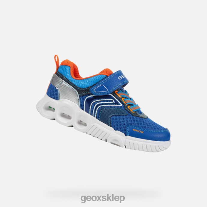 chłopięce tenisówki o aktywnym, dynamicznym stylu i świecącej podeszwie zewnętrznej. bardzo atrakcyjne i posiadające nieustraszoną atmosferę, tenisówki Wroom są również wyjątkowo wygodne. lekkie, elastyczne i ozdobione błyszczącymi, wielokolorowymi światłami wbudowanymi w modną grubą podeszwę zewnętrzną, są wykonane z siateczki i materiału imitującego skórę w kolorze królewskiego błękitu i pomarańczy.