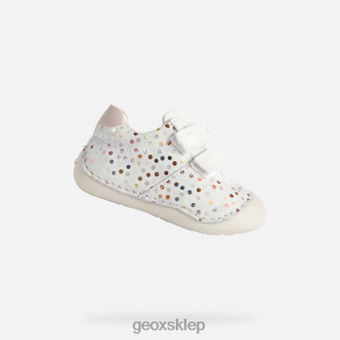 buty dziecięce dla małych raczkujących, zapewniające ochronę i najwyższy poziom dobrego samopoczucia. wykonane z drukowanego zamszu i materiału imitującego skórę w białej i jasnoróżowej palecie, tutim to oddychające, wygodne buty z praktycznym szybkim wejściem na stopę. to idealny wybór dla stylowych małych pełzaczy, z uroczą cholewką ozdobioną wielobarwnymi kropkami.